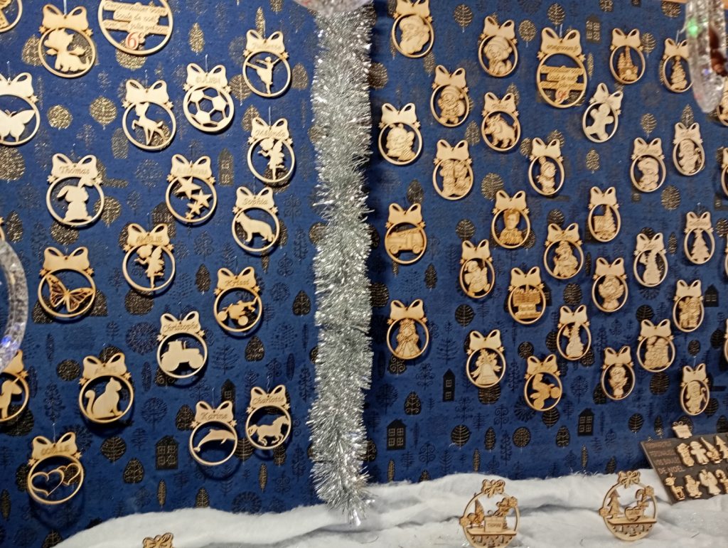 Weiter bin ich auf der Suche nach Christbaumschmuck und bleibe recht erfolglos. Kein Stand mit Kugeln in verschiedenen Farben oder Größen, mit einer Baumspitze, leichten Figuren, die in den Weihnachtsbaum gehängt werden können oder Schokoladenkringeln, die einem das Abräumen des Baumes am 6. Januar noch einmal versüßen. Es gibt geeignete Holzarbeiten, aber die ausgesprochen weihnachtlichen Motive sind doch deutlich in der Unterzahl, fast Randerscheinungen.