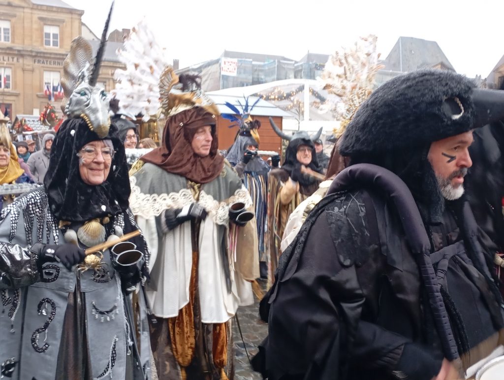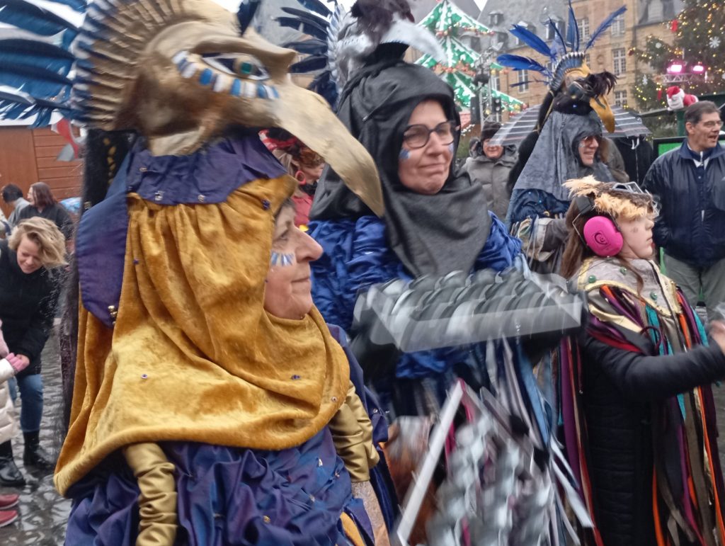 Gekleidet in abenteuerlichen Phantasiegewändern hupen, trommeln, rätschen oder pauken sie über den Weihnachtsmarkt als wollten sie jetzt schon Väterchen Frost in die Höhenzüge der Ardennen vertreiben. Schön anzusehen, nicht zu überhören, und die Musiker gut auf einander abgestimmt, aber mir erschließt sich nicht der Hintergrund oder der Zusammenhang mit dem Weihnachtsmarkt.